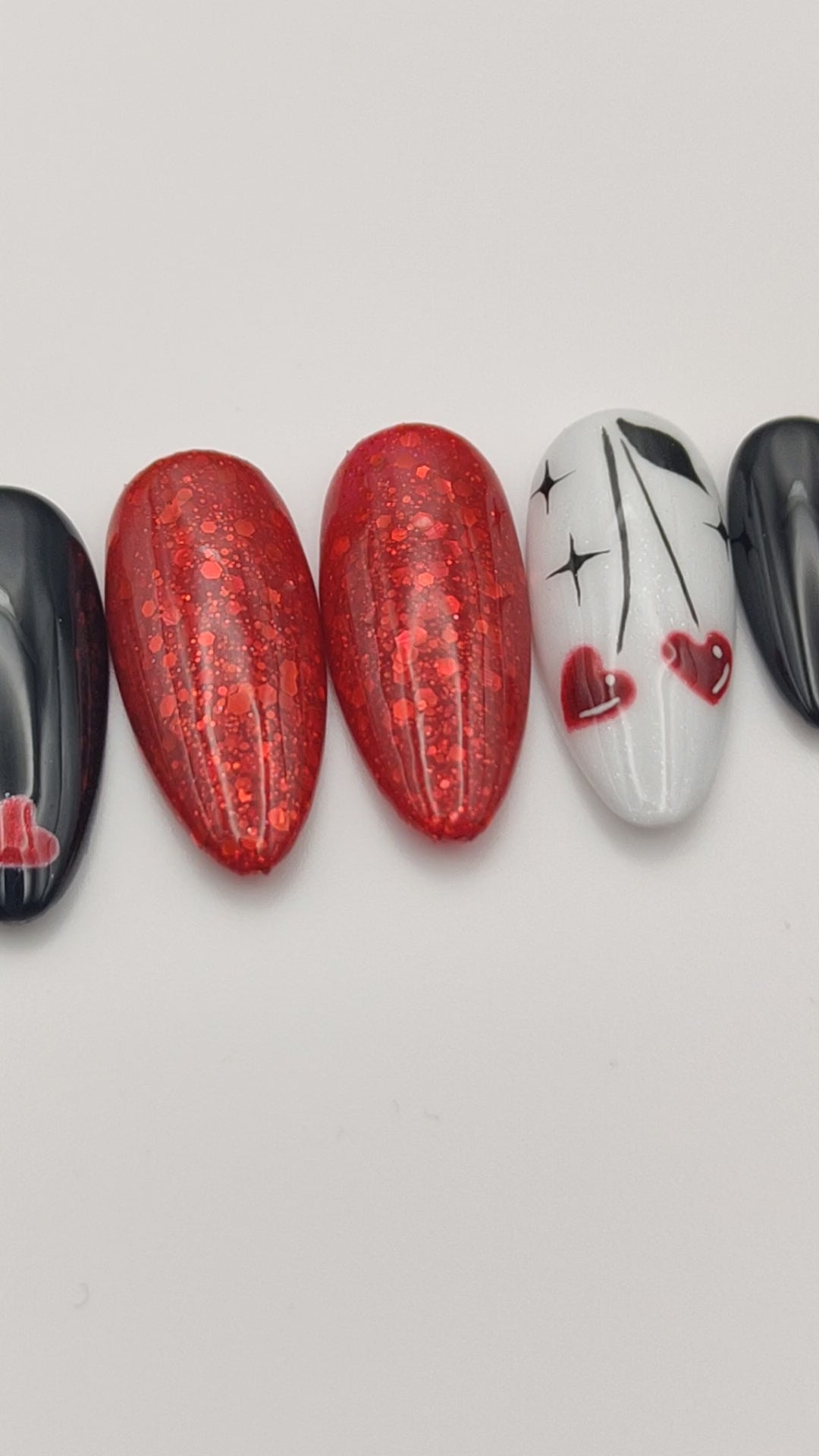 • Motifs : Contraste noir, blanc et rouge pailleté, cœurs peints à la main, effet cat eyes et glitter