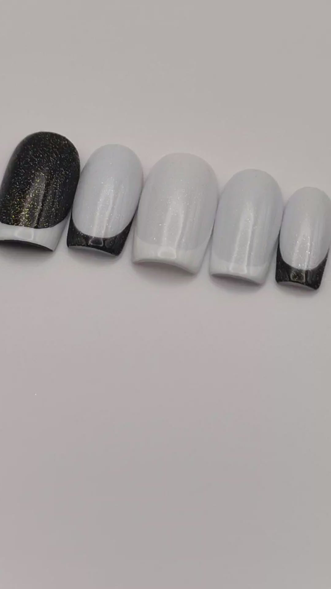 Éclipse d’Alexandrie repose sur une base laiteuse lumineuse, délicatement pailletée, qui illumine la main avec douceur. La French se dessine en noir profond et blanc pur, créant un contraste élégant et graphique, subtilement rehaussé de reflets dorés.