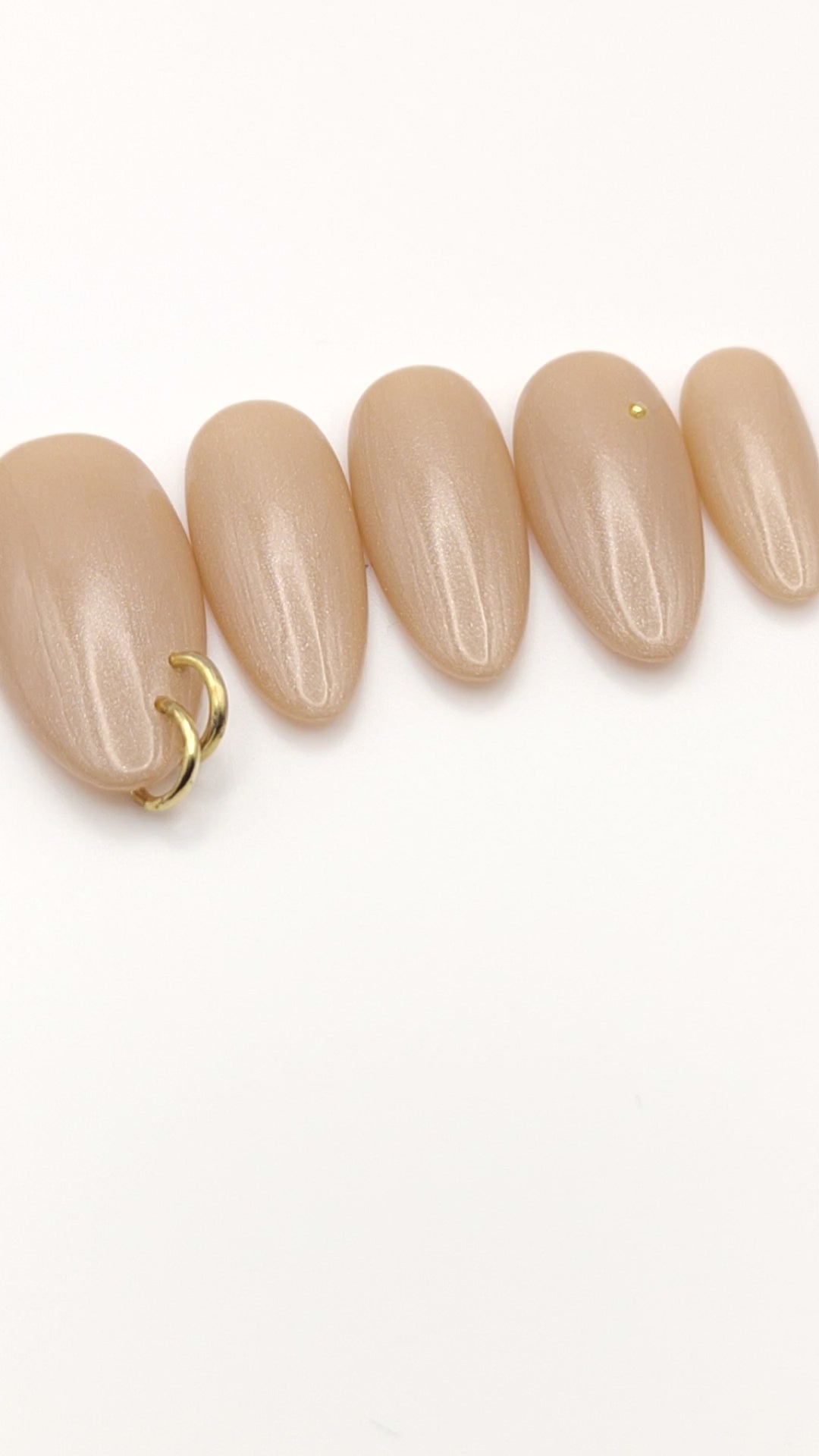 La teinte sable habille l’ongle avec douceur et élégance, tandis que les anneaux dorés et le détail lumineux apportent une dimension bijou raffinée.