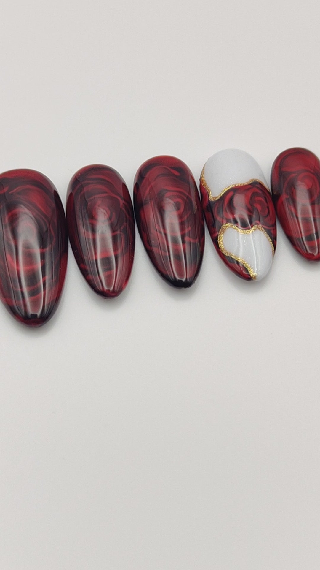 Ses motifs inspirés des roses, mêlés aux contrastes du rouge, du noir et du blanc nacré, offrent une manucure puissante et élégante à la fois.