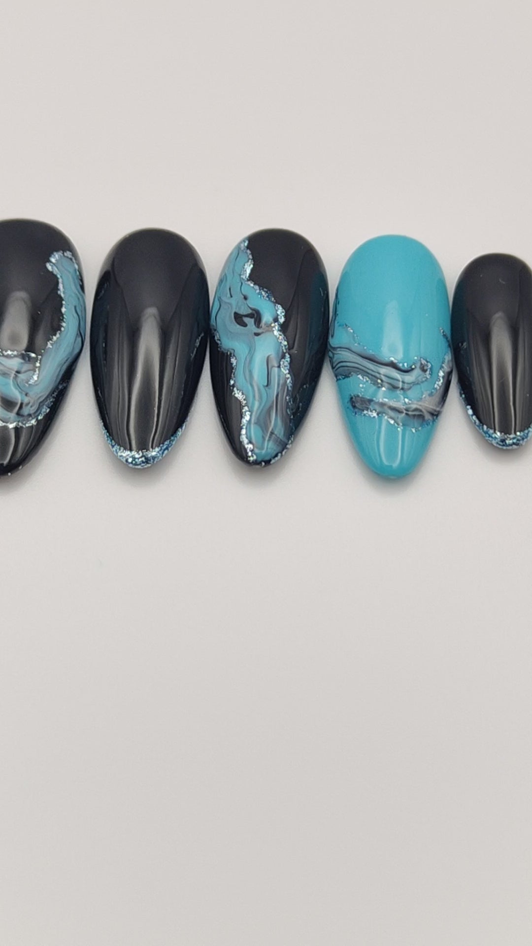 Sur une base noire intense et un turquoise lumineux, des courants marbrés viennent serpenter l’ongle comme des sillages marins, soulignés de reflets métallisés.